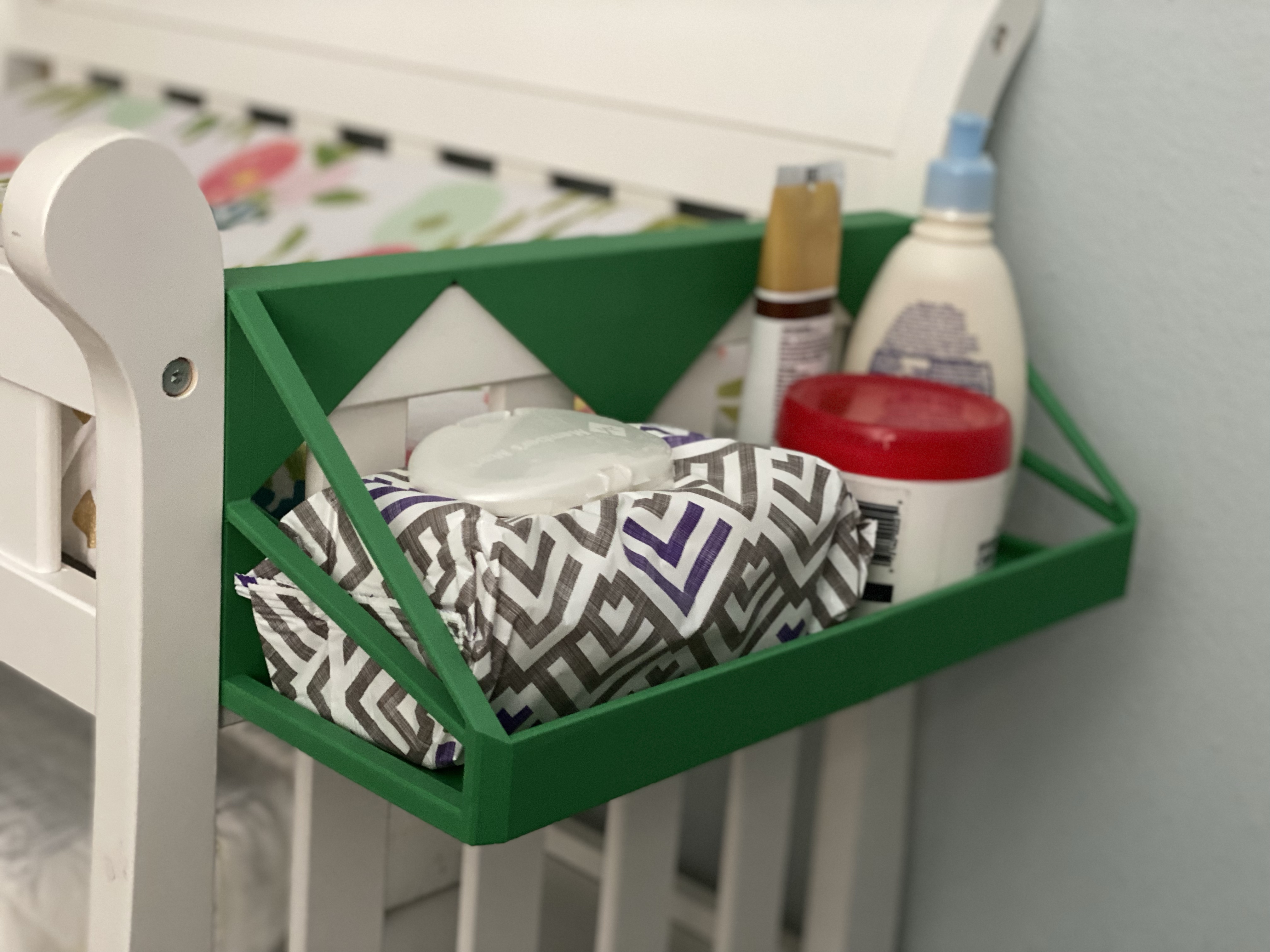 After a few months, we also realized that children are wiggly and have a habit of making messes and rolling around in open poopy diapers as soon as you look away. At first, we kept her wipes and things in the changing area so we could easily reach them while keeping a hand on her. Soon she started to grow and liked to kick her feet, knocking over any wipes or creams we had near her.